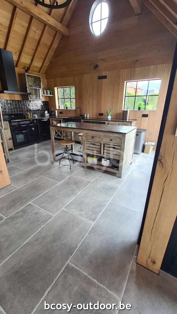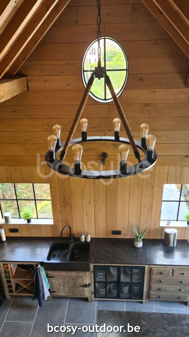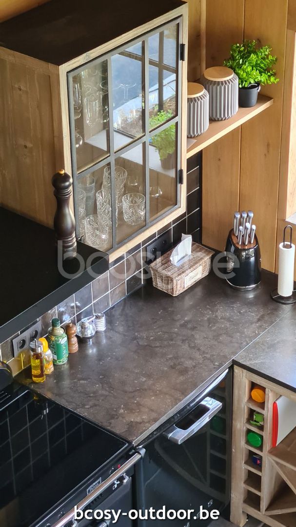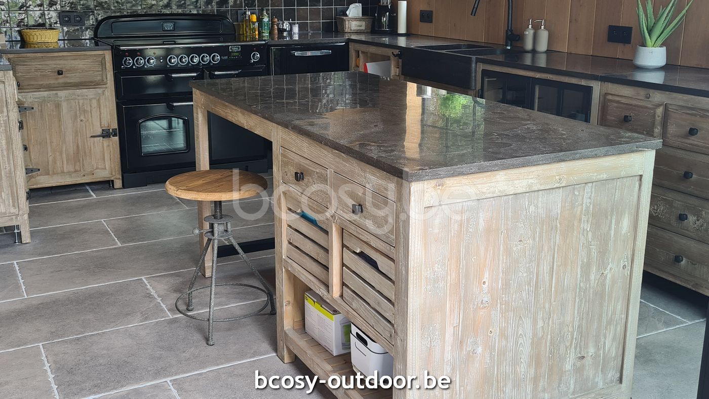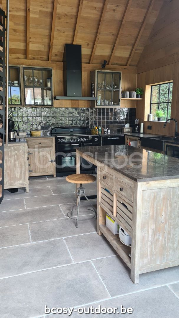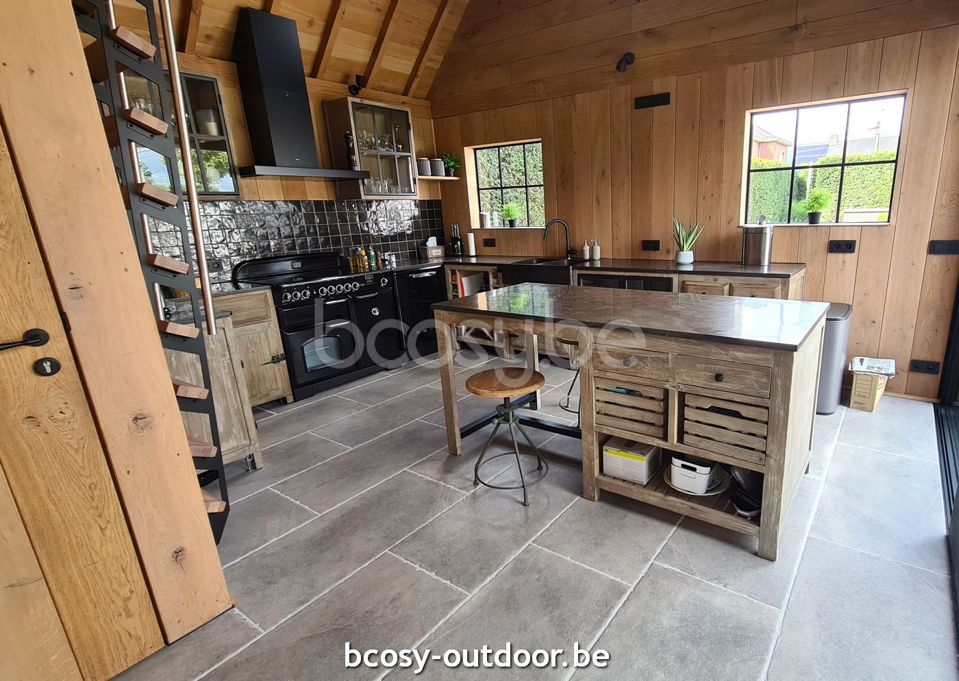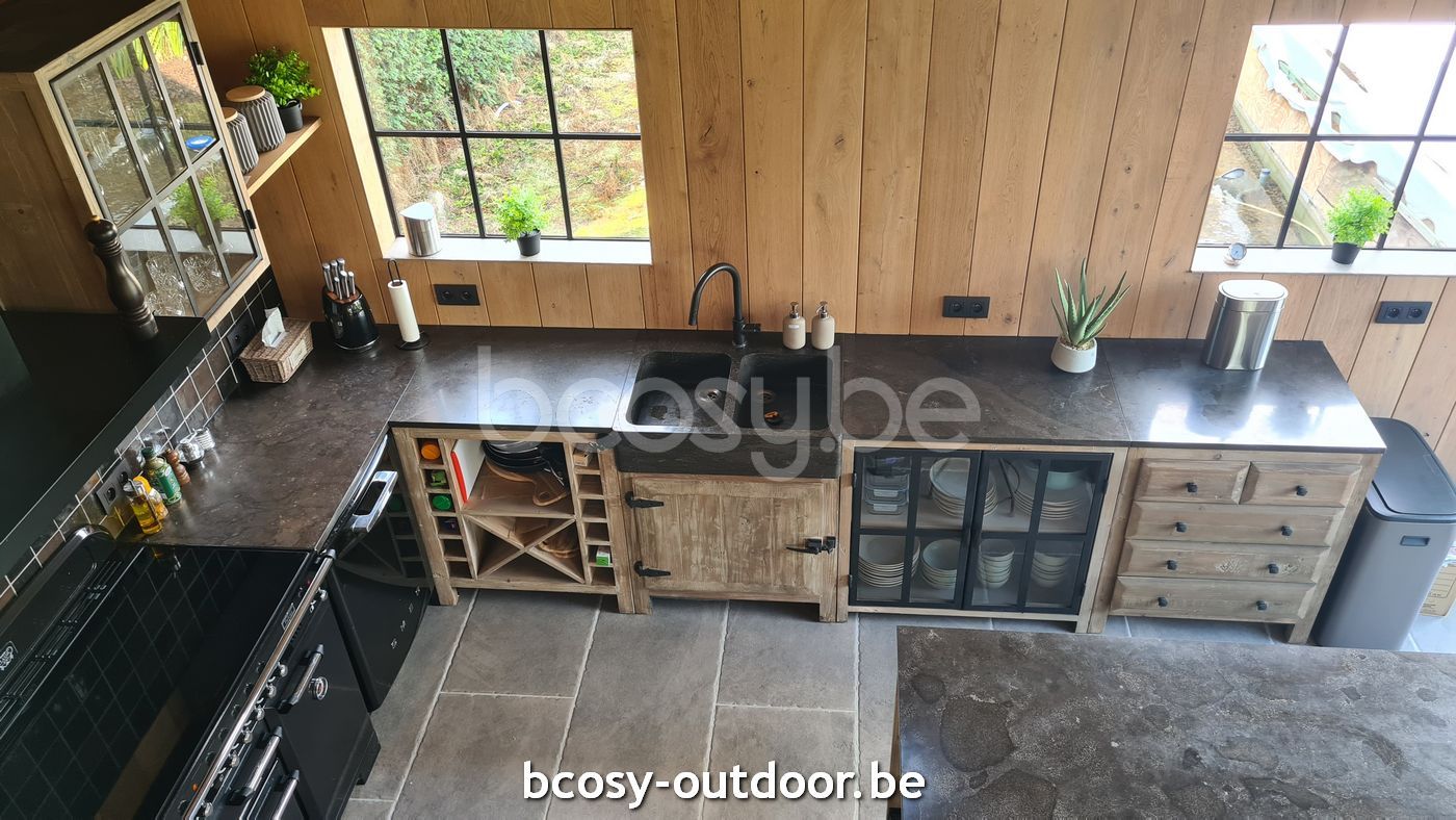 Volledig modulaire keuken voor je landelijk houten bijgebouw. Alle modules kunnen anders geschikt worden. Massief arduinen spoelbak van 60 kg met de hand vervaardigd.