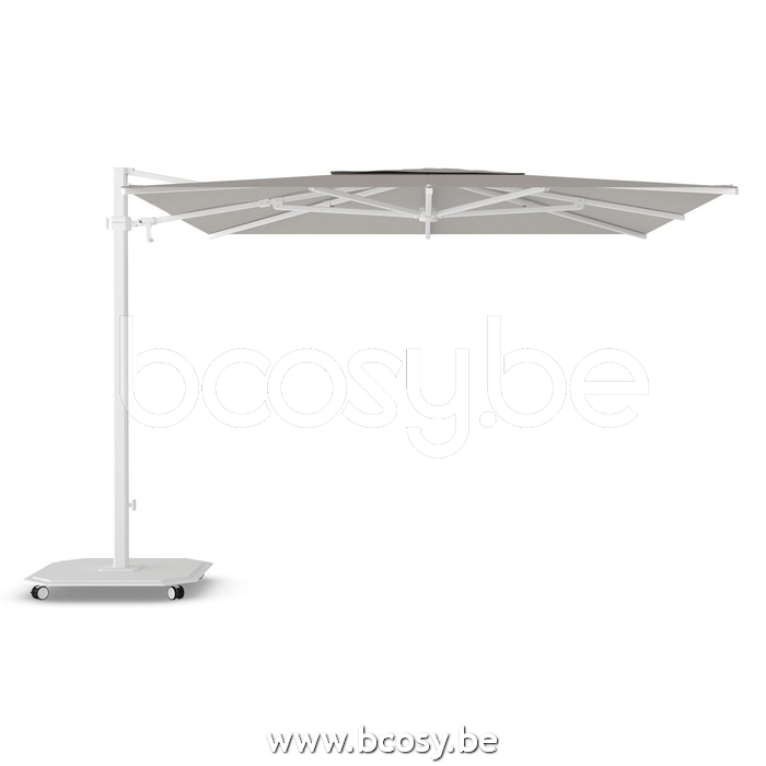 Pied de parasol: Tôle d'acier galvanisé à chaud, thermolaqué. Inclus à l'achat du parasol. Socle avec 4 roues qui tournent à 360°, chacune avec des freins pour fixer le parasol. Le socle a la même couleur que le mât. Un socle en charcoal est fournie pour un mât en alu teck.