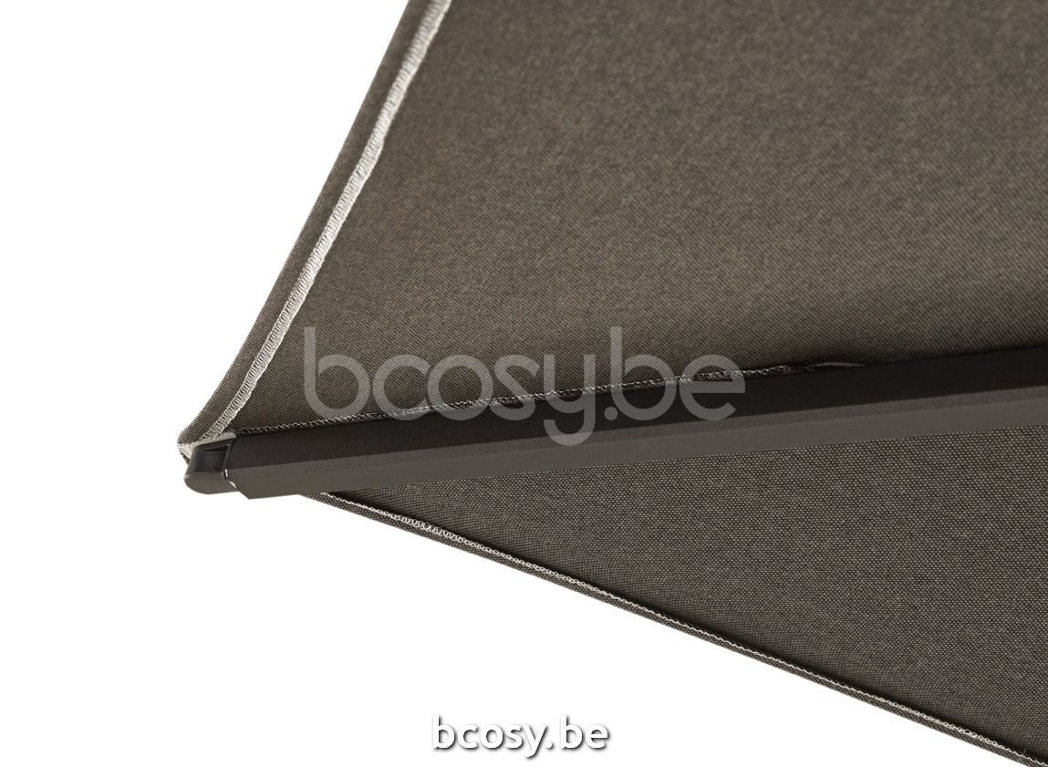 Model: Vrijhangende parasol met opendraaier. Mast en baleinen zijn aluminium gepoederlakt. Profiel mast: 80 x 80 x 2,3 mm, 3,5 x 3,5 x 0,09". Profiel baleinen: 22 x 22 x 1,6 mm, 0,9 x 0,9 x 0,06". RVS LOXX® om het doek eenvoudig aan het frame te bevestigen en af te nemen. Ook verkrijgbaar met een grondanker aan een lagere prijs.
