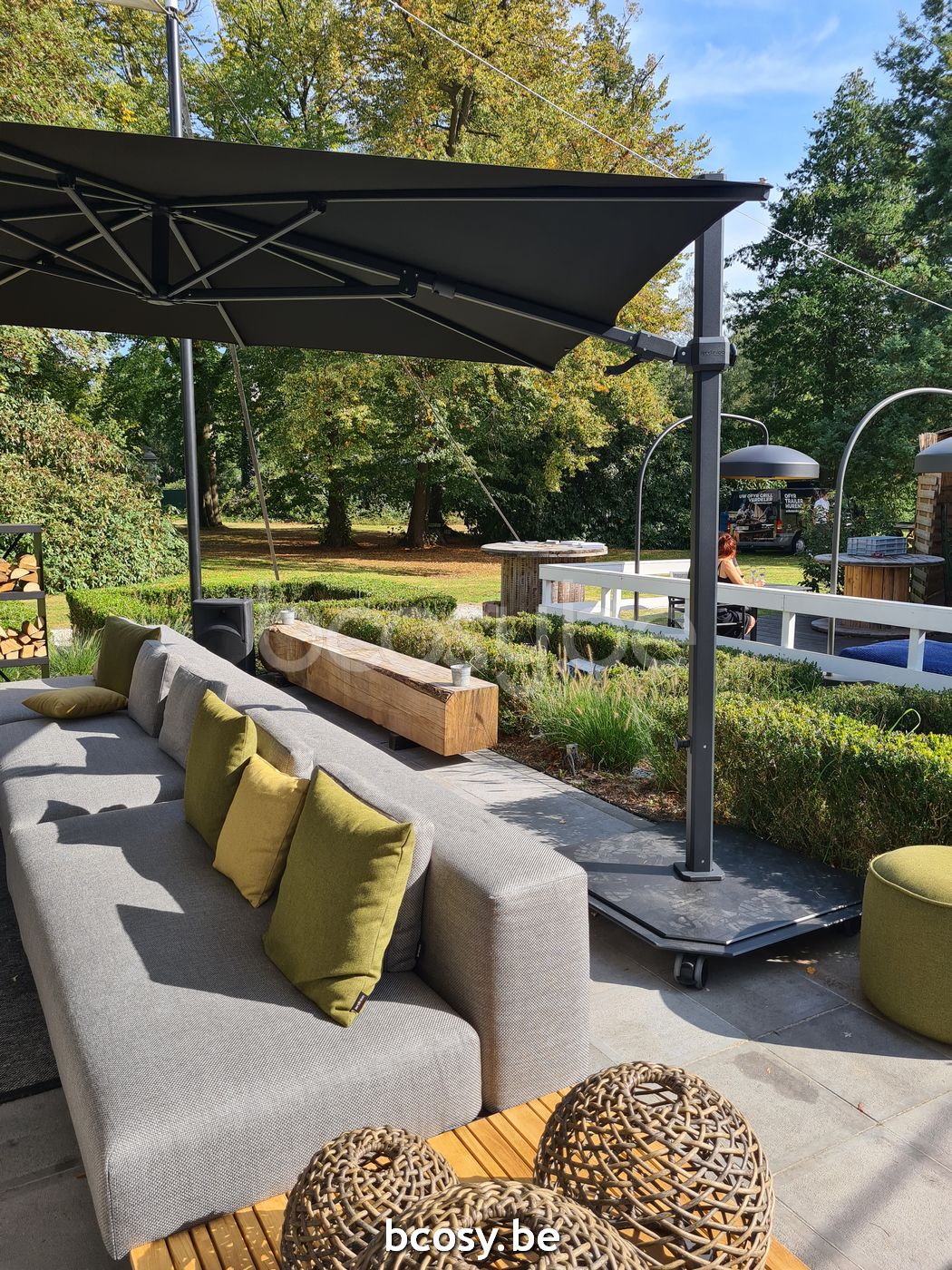 Jardinico CARACTERE JCP301 300x300 Vierkante Vrijhangende Zwevende Parasol Met Vrijstaande Mastpaal 3x3 Antraciet-charcoal-charcola Gepoederlakt Aluminium Mast-paal| Parasoldoek Pitch Sunbrella Plus Marine cat3