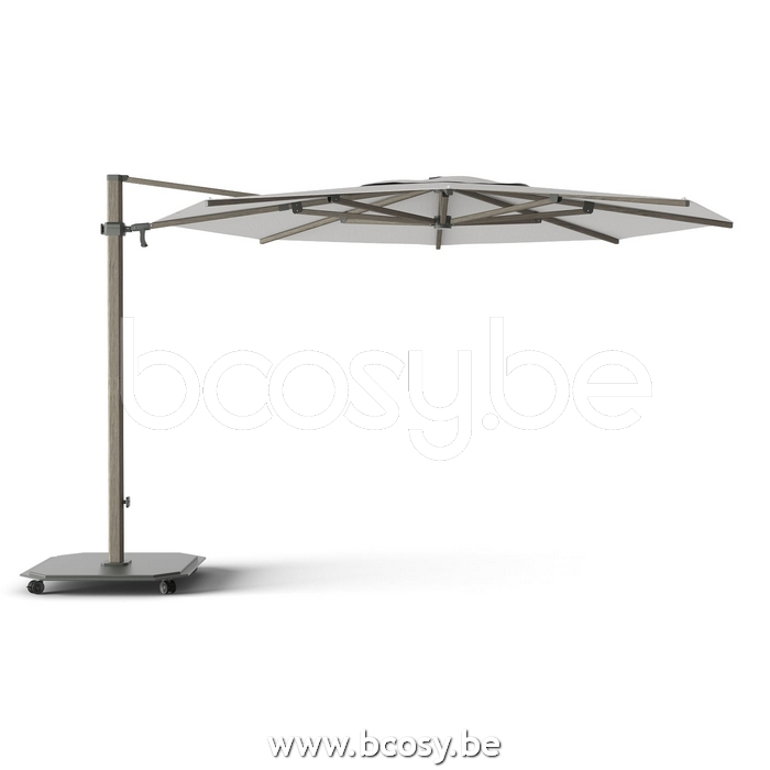 Pied de parasol: Tôle d'acier galvanisé à chaud, thermolaqué. Inclus à l'achat du parasol. Socle avec 4 roues qui tournent à 360°, chacune avec des freins pour fixer le parasol. Le socle a la même couleur que le mât. Un socle en charcoal est fournie pour un mât en alu teck.