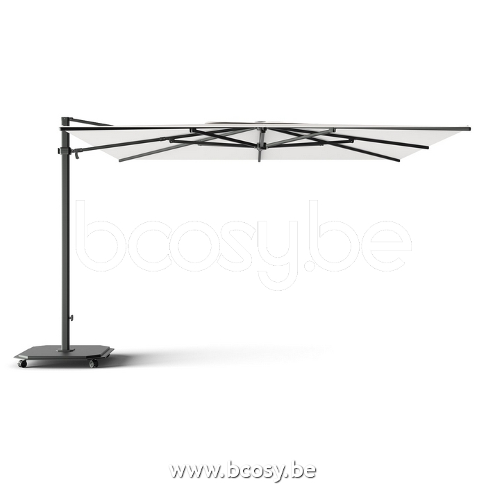 Pied de parasol: Tôle d'acier galvanisé à chaud, thermolaqué. Inclus à l'achat du parasol. Socle avec 4 roues qui tournent à 360°, chacune avec des freins pour fixer le parasol. Le socle a la même couleur que le mât. Un socle en charcoal est fournie pour un mât en alu teck.