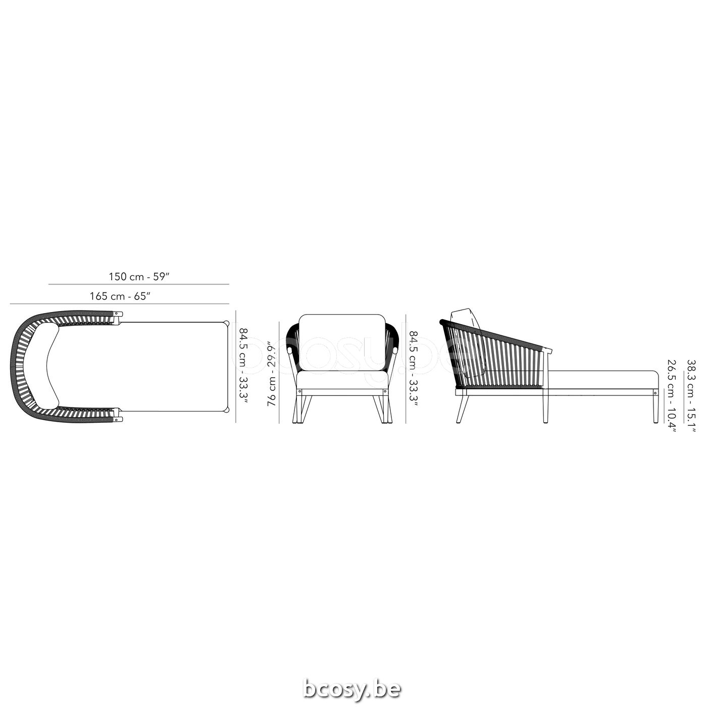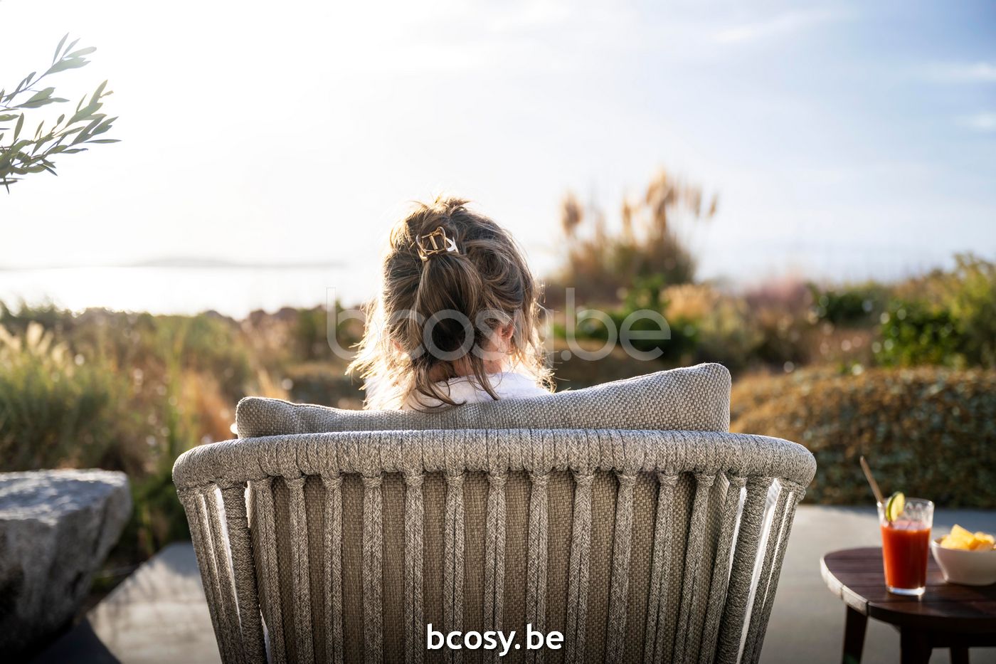 Kussens: Alle kussens zijn gevuld met all weather foam. Een geavanceerd schuim met hoge prestaties, ontwikkeld voor buitentoepassingen. De categorie van de kussens is afhankelijk van het type stof.