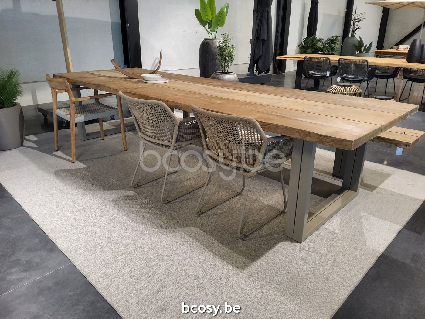Materiaal: Aluminium gepoederlakte structuur en tafelblad in ruwe Teak Boomstam