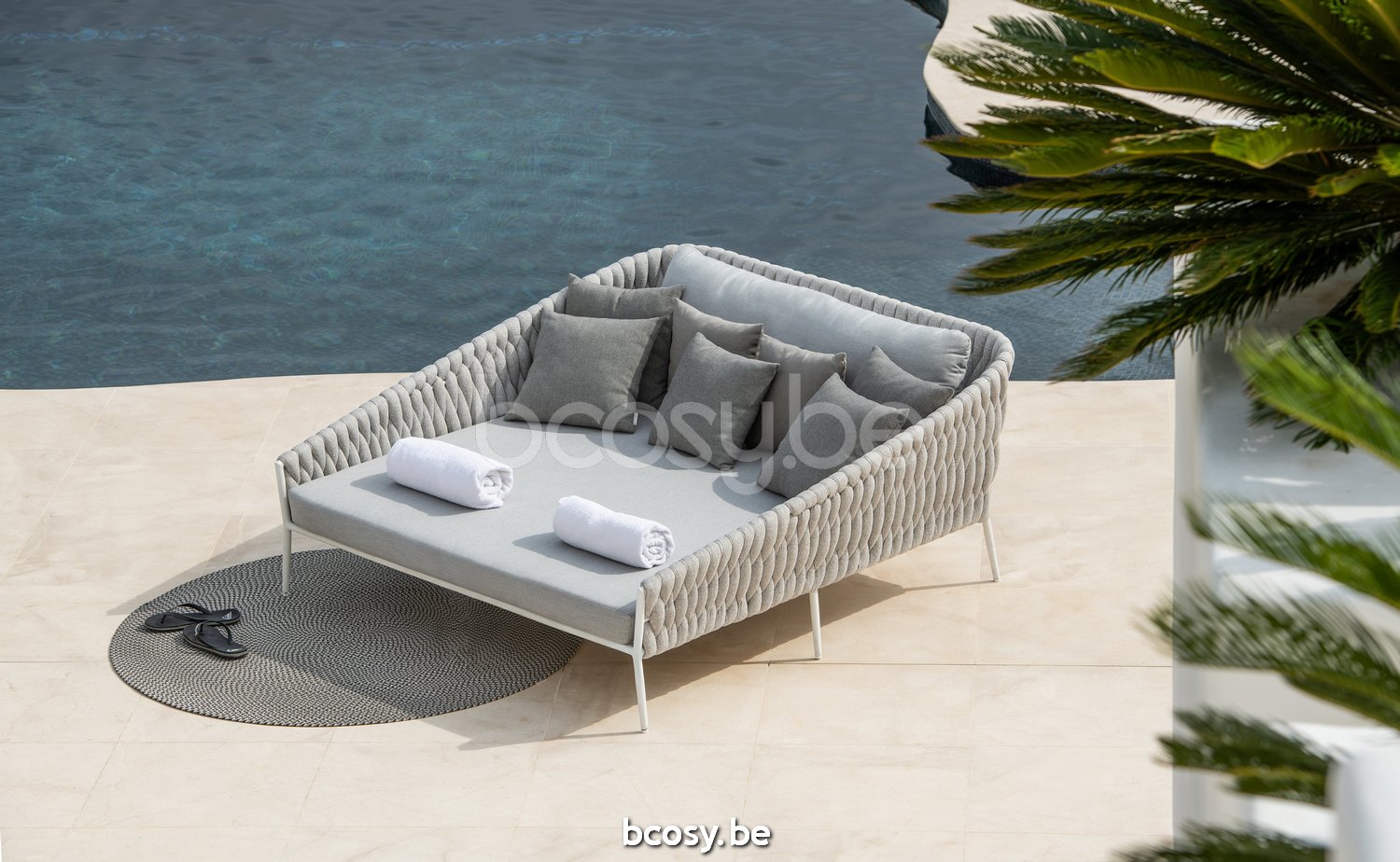 English: Jati-Kebon Fortuna Socks Double daybed Sunbrella natte grey chine nat 10022 quick dry foam White mat aluminium (3599 /pc)