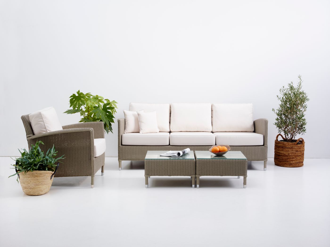 Material: Lloyd Loom treated for outdoor use on an aluminium frame. Should be stored indoors during humid and cold weather. But only suitable for dry climates.