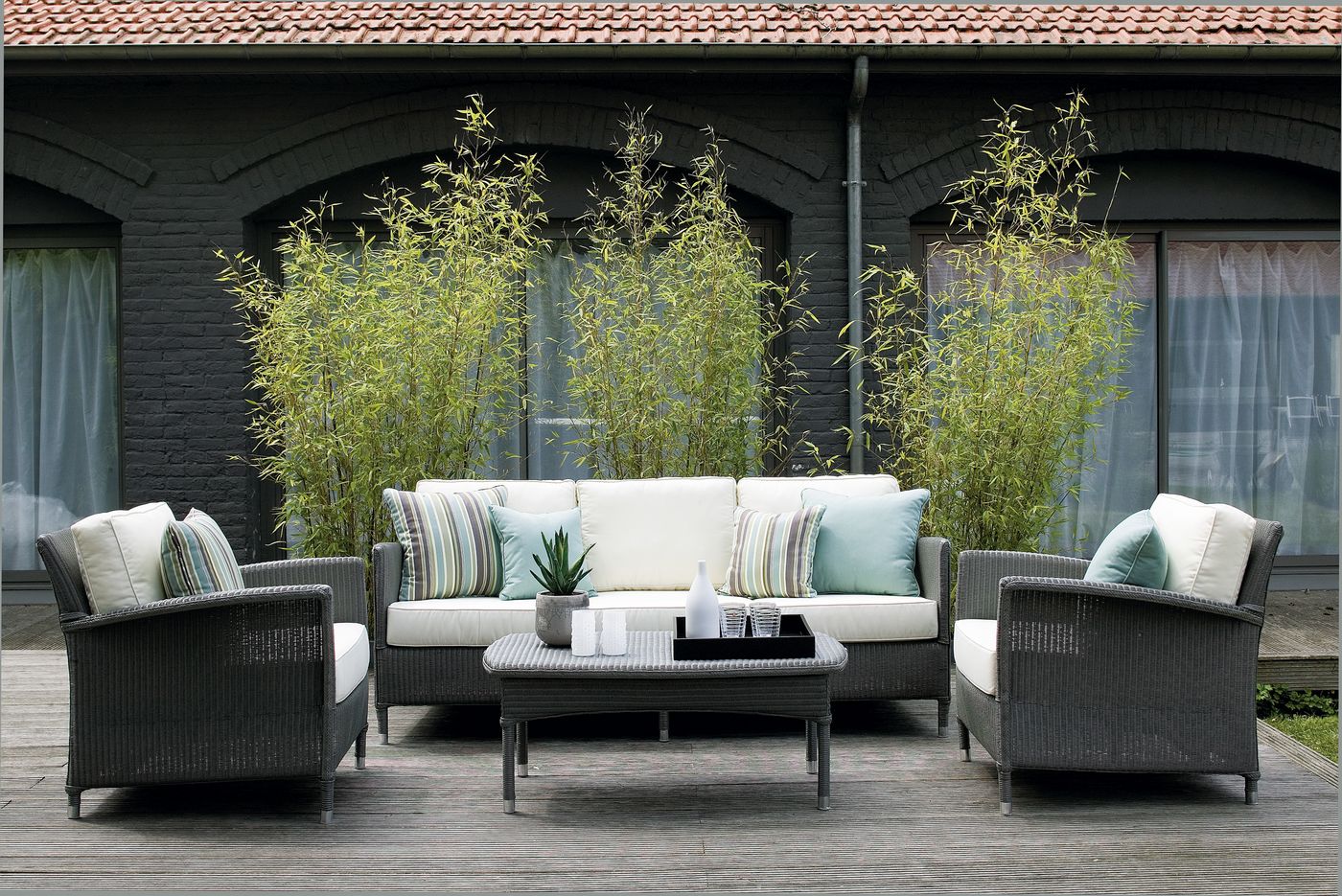 Material: Lloyd Loom treated for outdoor use on an aluminium frame. Should be stored indoors during humid and cold weather. But only suitable for dry climates.
