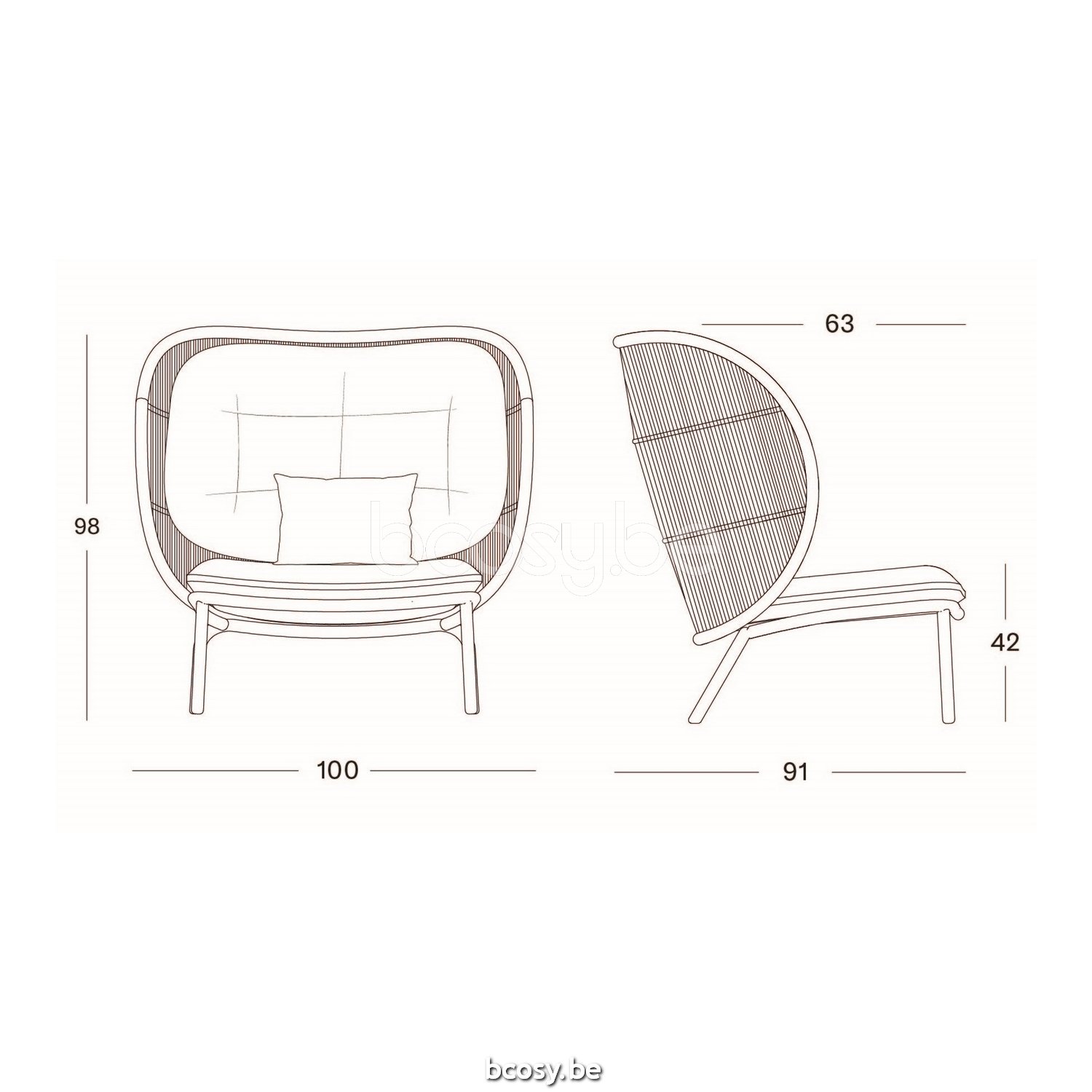 Afmetingen/Dimensions/Dimensionen: L=100 cm B=91 cm H=98 cm SH=42 cm SD=63 cm