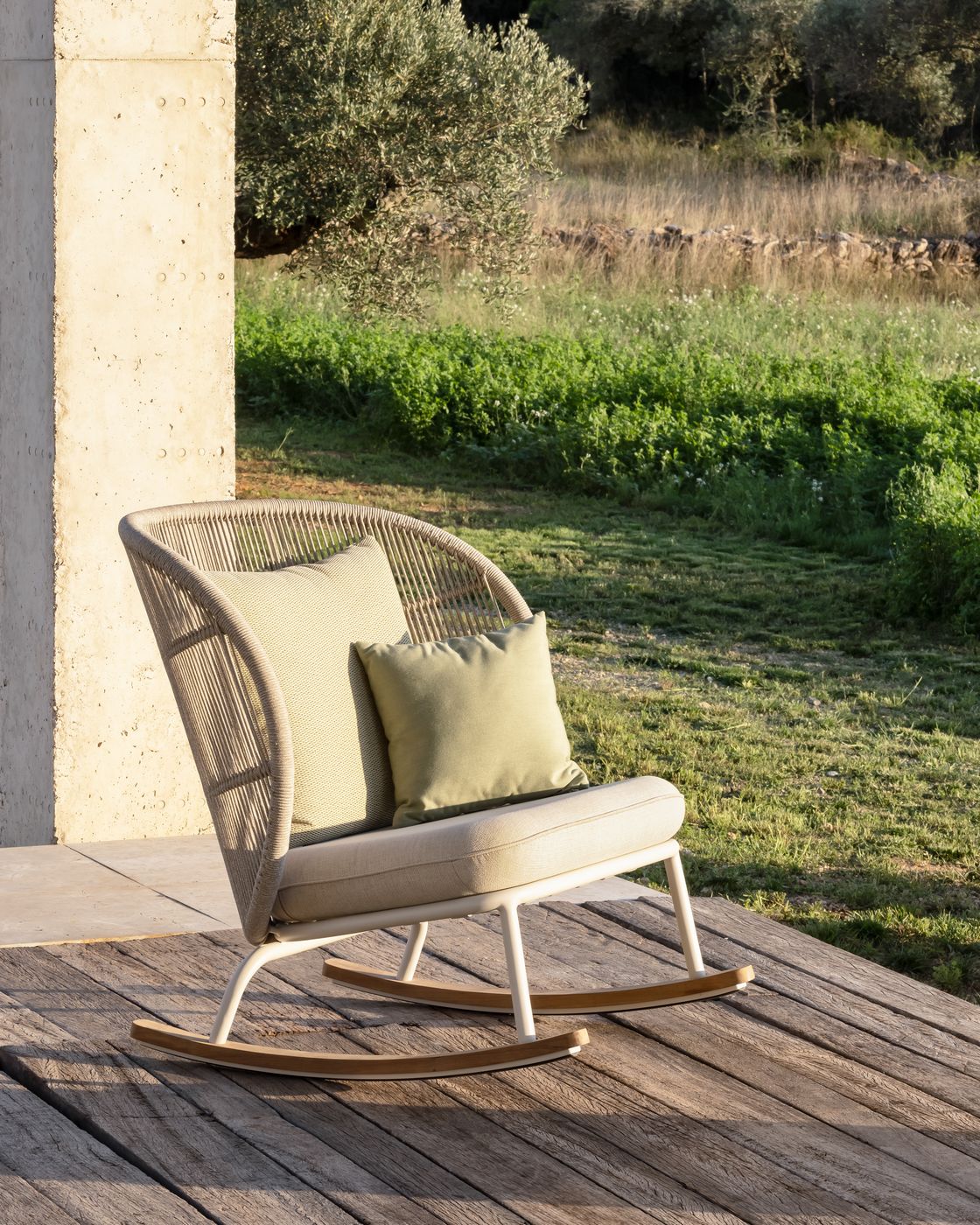 English: Vincent Sheppard Kodo Rocking Chair Dune White Aluminium frame Dune White Rope Polypropylene Slats in teak