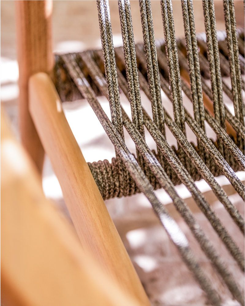 Material: Polypropylene rope on an untreated teak frame. White nylon glides.