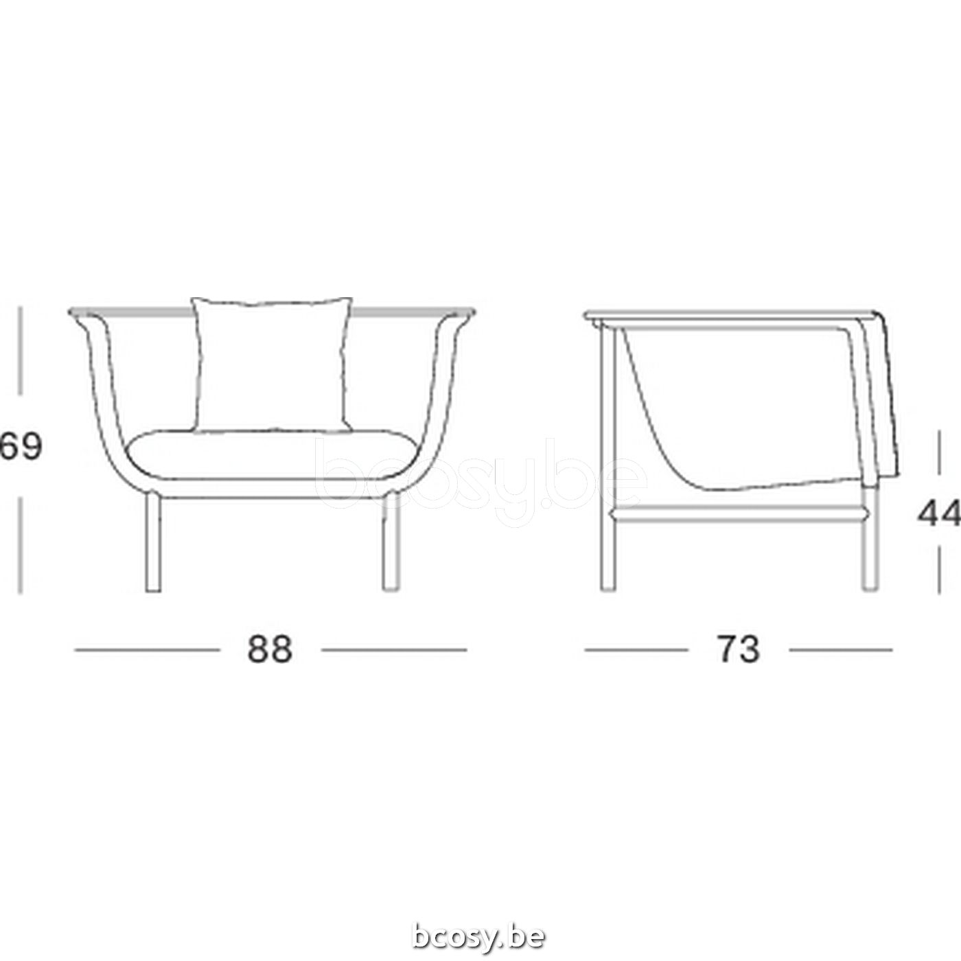 Afmetingen/Dimensions/Dimensionen: L=88 cm B=73 cm H=69 cm SH=44 cm AH=69 cm