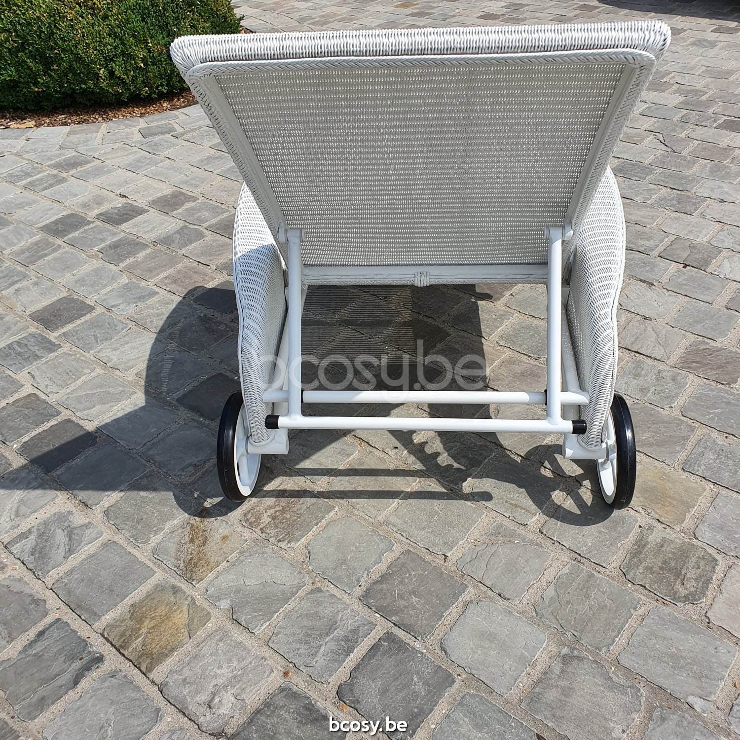 Materiaal: Lloyd Loom behandeld voor buitengebruik op een aluminium frame. Moet binnen opgeslagen worden bij vochtig en koud weer. Maar alleen geschikt voor droge klimaten.