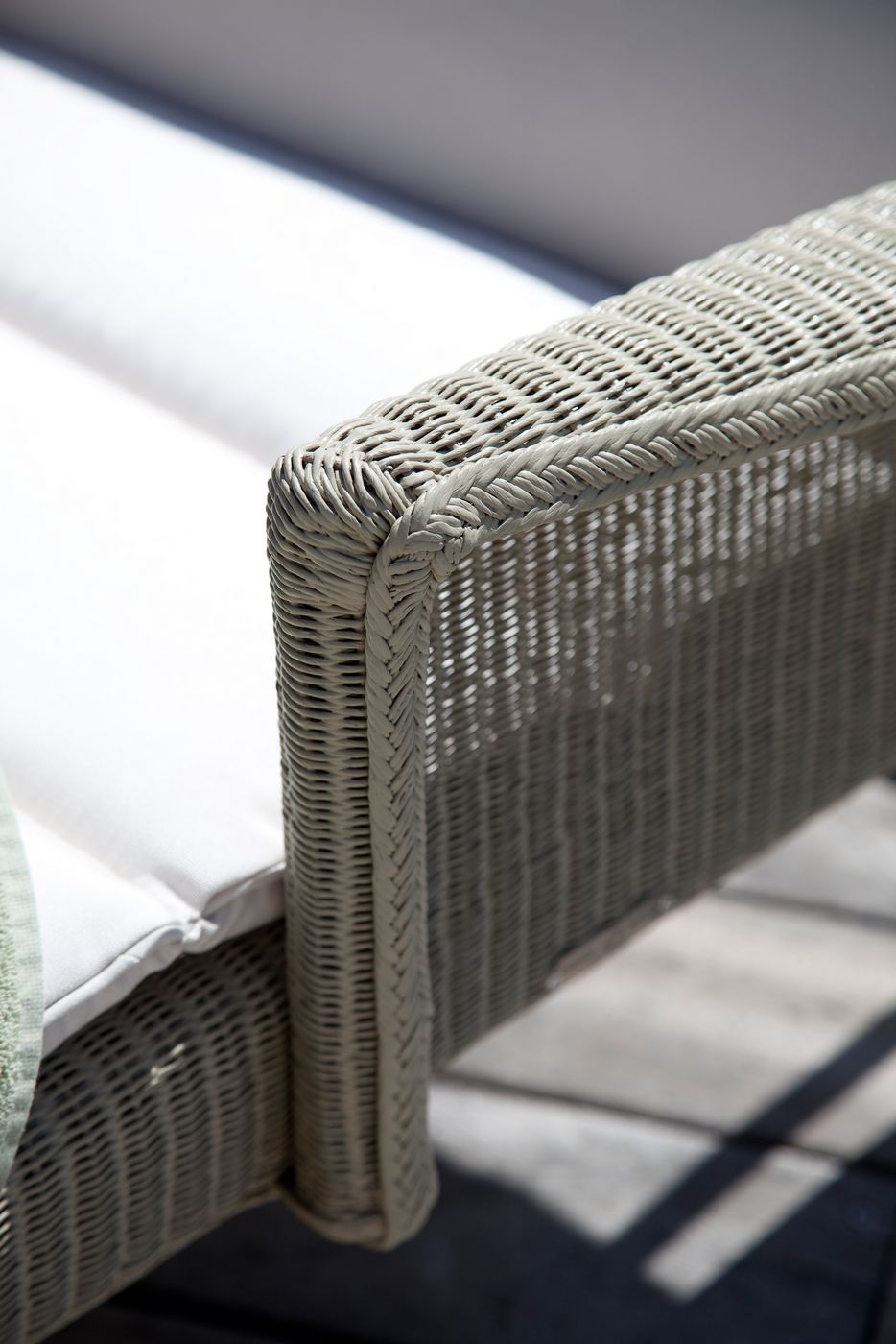 Matériel: Lloyd Loom traité pour une utilisation en extérieur sur un cadre en aluminium. Doit être stocké à l'intérieur par temps humide et froid. Mais ne convient qu'aux climats secs.