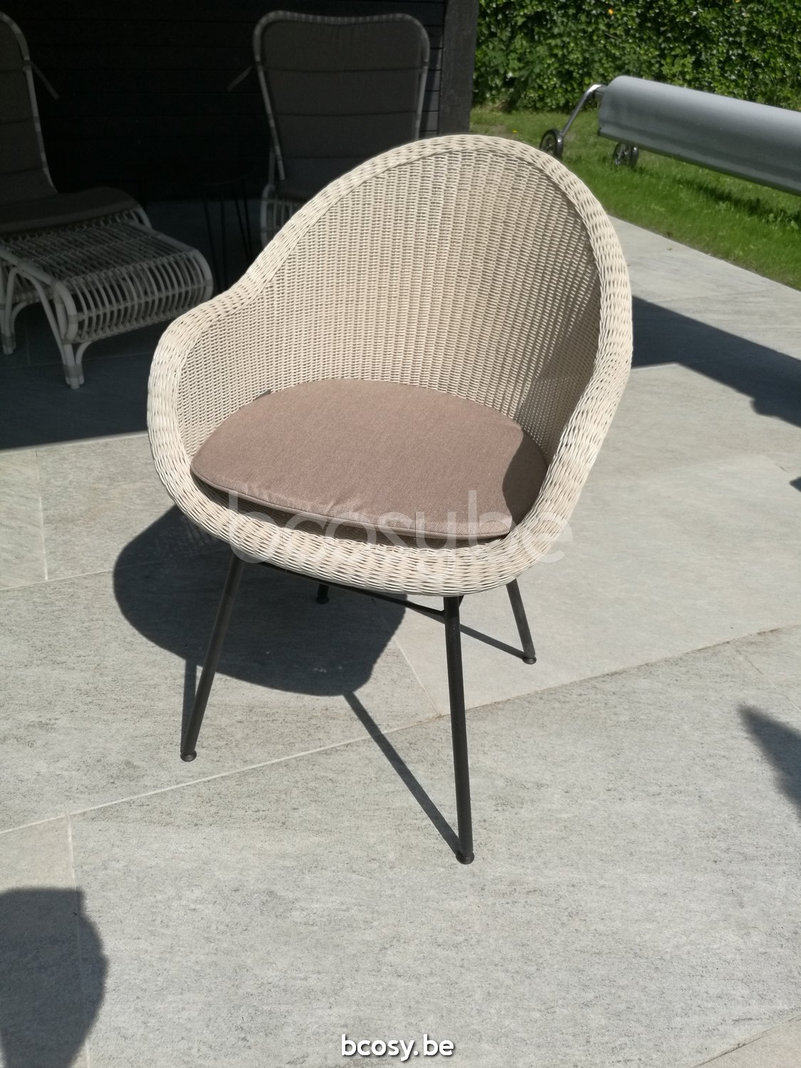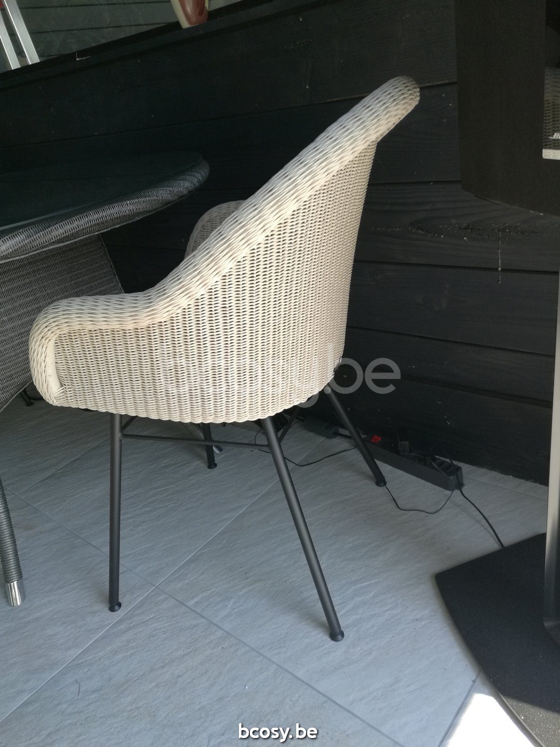 Materiaal: Polyethyleen wicker vlechtwerk op een aluminium frame en een epoxy en gegalvaniseerd zwart gepoedercoat stalen onderstel.