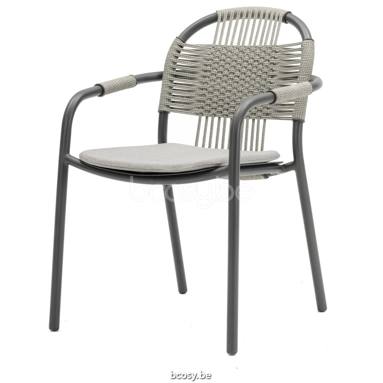 Materiaal: Polypropyleen touw op een gepoedercoat aluminium frame. Stapelbaar voor max. 4 stoelen. Voorzichtig behandelen om beschadiging te voorkomen.