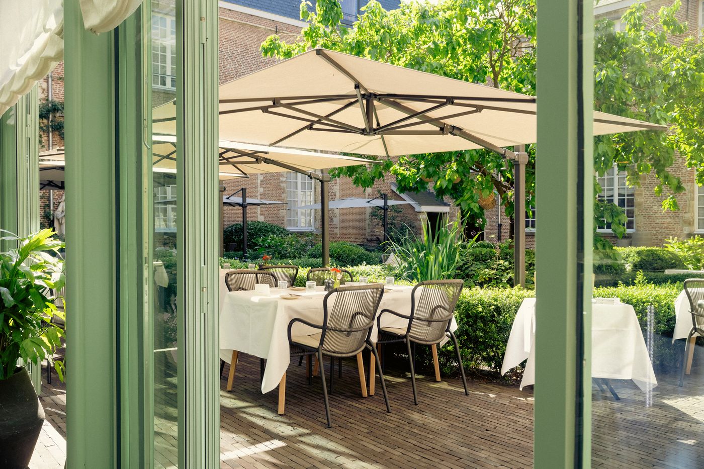 Material: Polypropylenseil auf einem pulverbeschichteten Aluminiumrahmen (Dune White, Taupe, Fossil Grey, Moss, Terracotta und Rust).