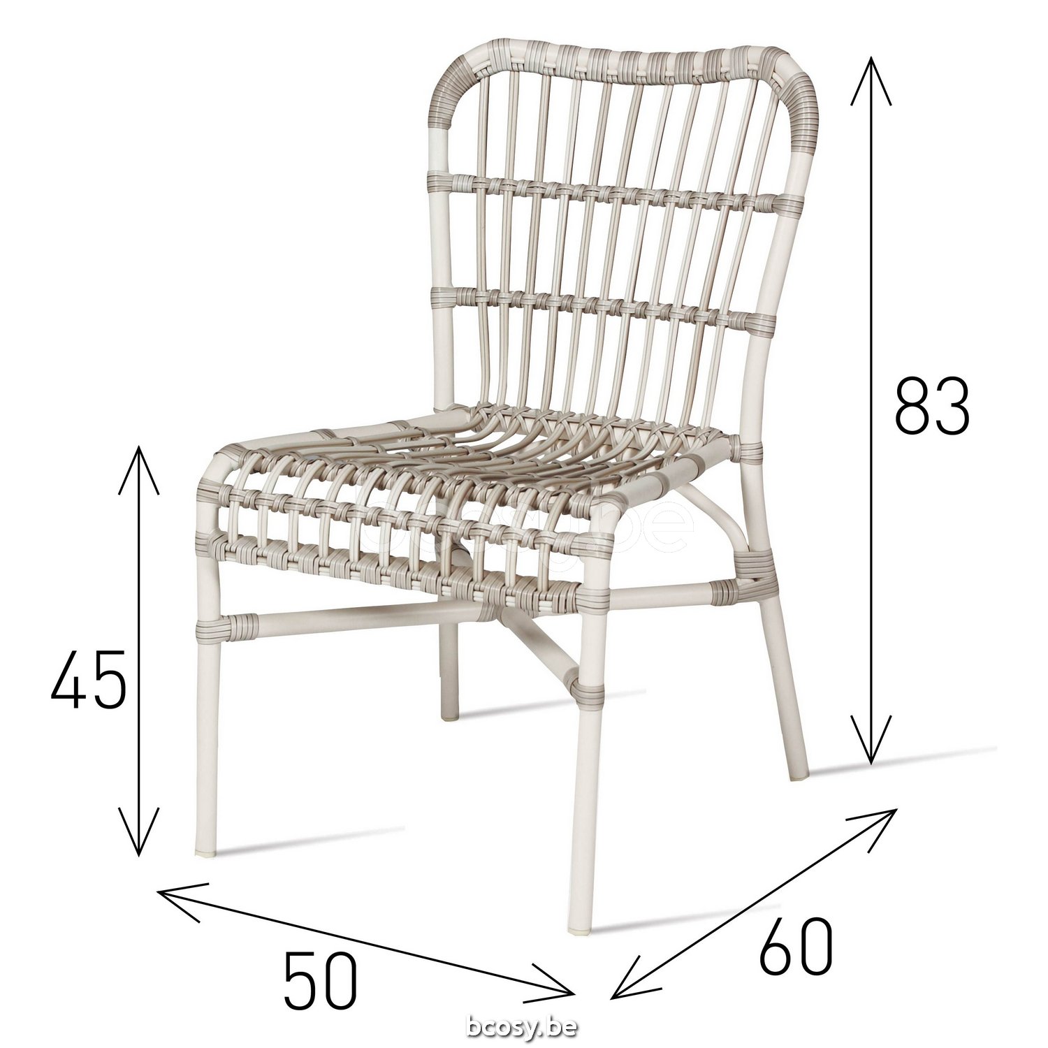 Materiaal: Polyethyleen vlechtwerk op een aluminium frame. Stapelbaar (max. 4 stoelen / voorzichtig behandelen om beschadiging te voorkomen).