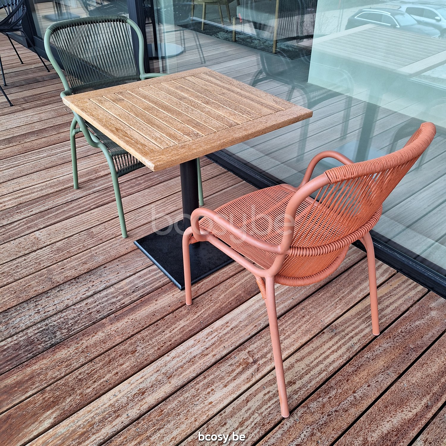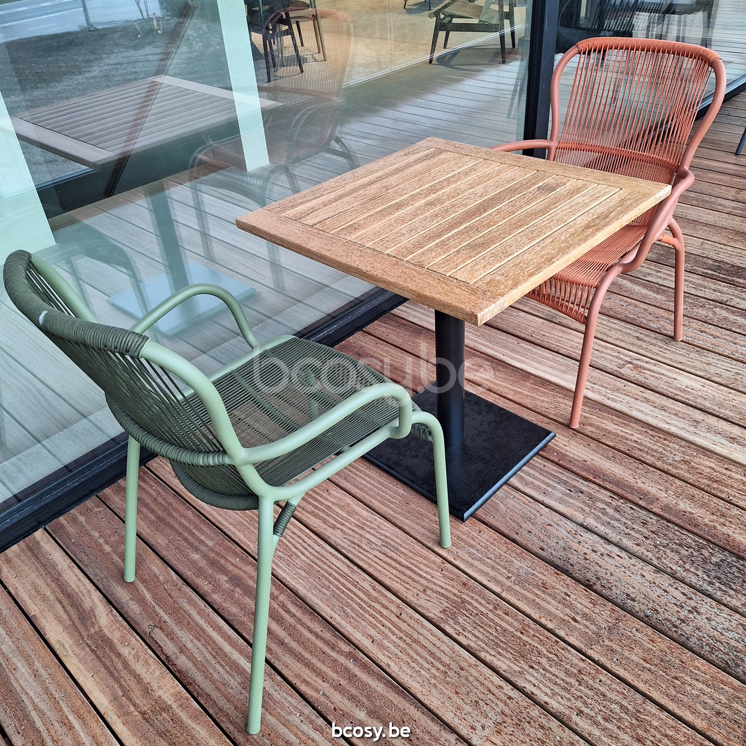 Français: Vincent Sheppard Quadro Table Bistro carrée Cadre en Acier Noir dessus de table Teck non traité