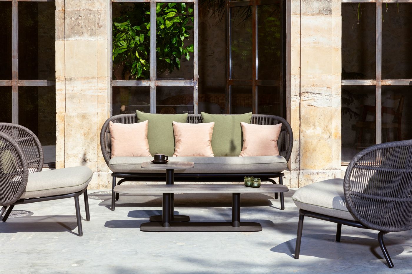 English: Vincent Sheppard Kodo Garden coffee Table 129X45 Fossil Grey Aluminium frame Flint Ceramic top 12mm