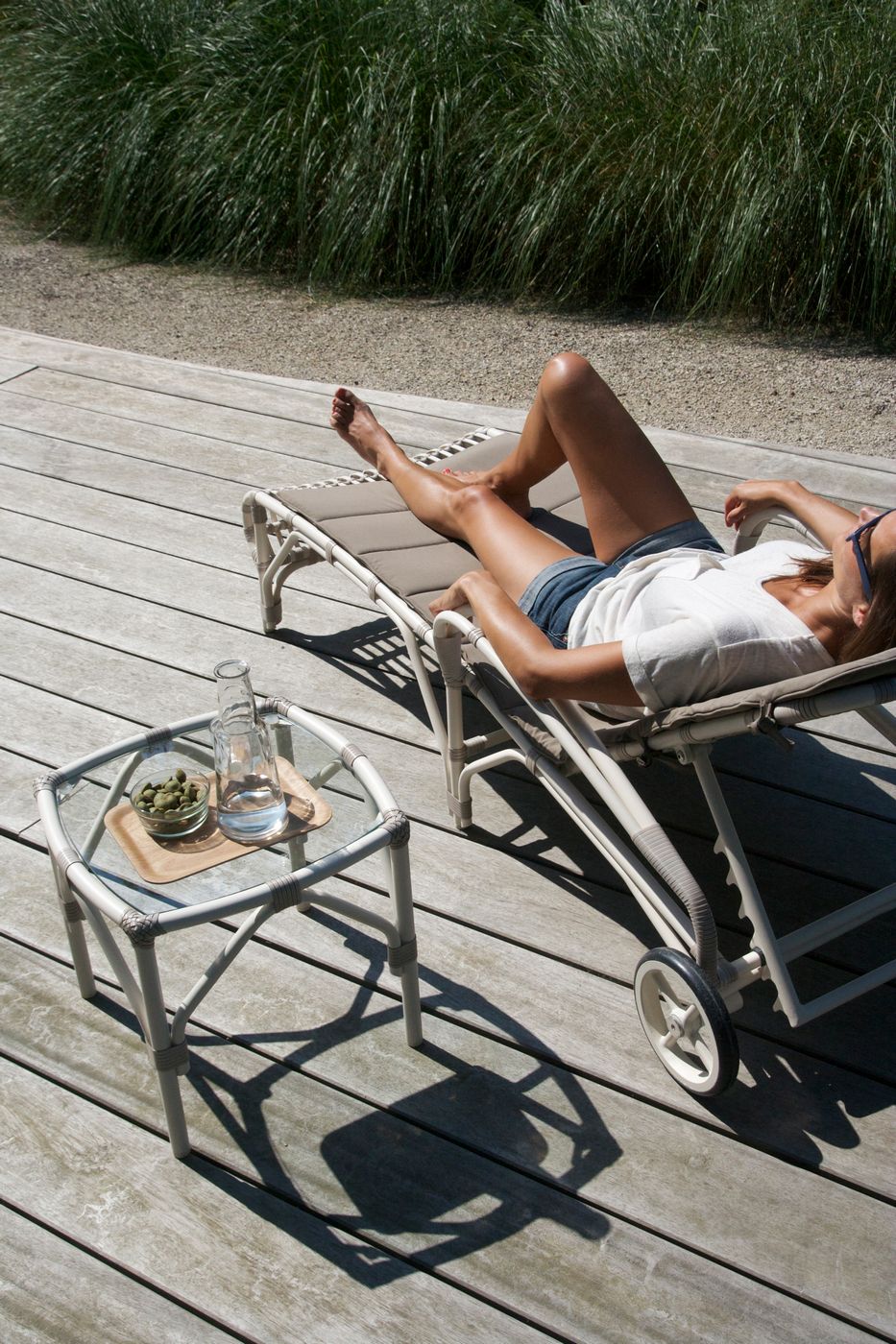 Matériel: Tressage en polyéthylène sur un cadre en aluminium laqué par poudrage. Verre inclus