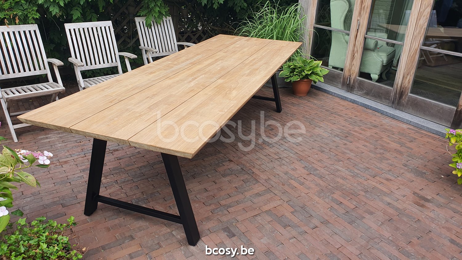 English: Vincent Sheppard Matteo Garden Dining Table 285x100 Black Aluminium frame Untreated Teak top