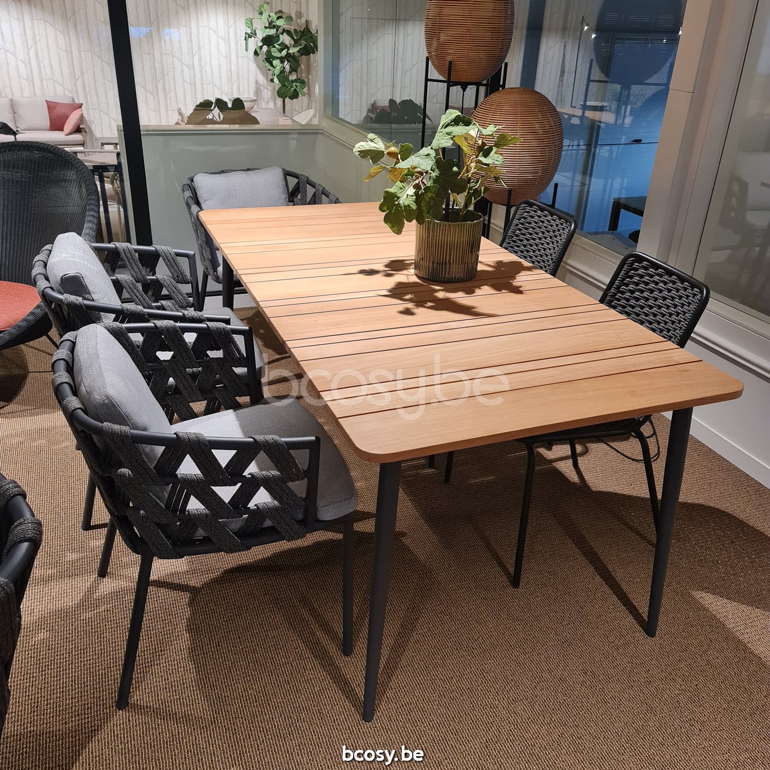 Materiaal: Structuur van gepoedercoat aluminium met een onbehandeld massief teakblad, keramisch blad of zwart HPL blad.