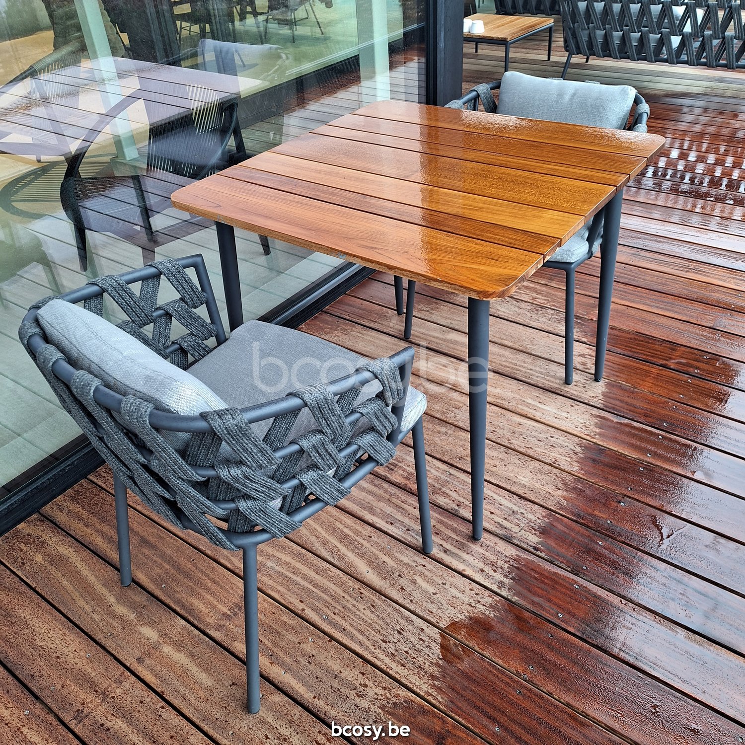 Materiaal: Structuur van gepoedercoat aluminium met een onbehandeld massief teakblad, keramisch blad of zwart HPL blad.