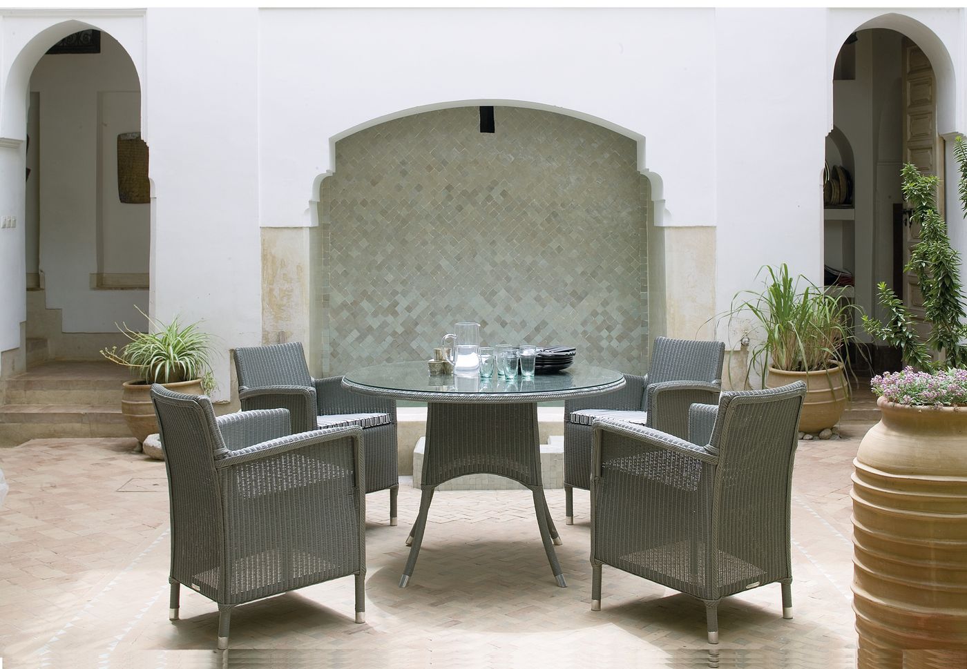Material: Outdoor treated Lloyd Loom weave on an aluminium frame. Should be stored indoors during humid and cold weather. Optional glass top available.