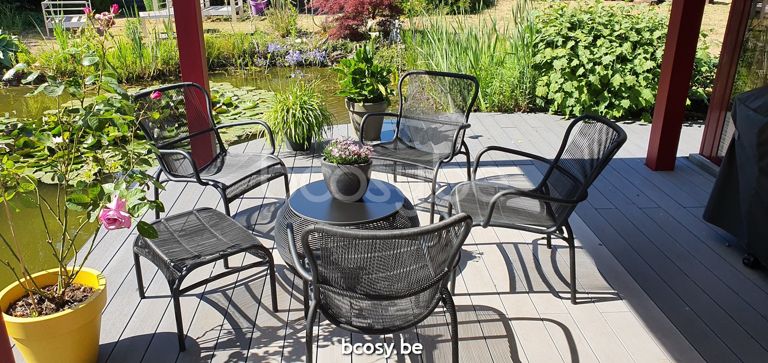 Matériel: Cadre en aluminium avec tressage HDPE et panneau HPL.