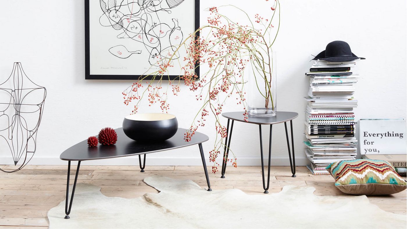 Deutsch: Vincent Sheppard Rozy Kaffeetisch Plektrum Form Rahmen aus Schwarz Stahl Tischplatte Schwarz HPL