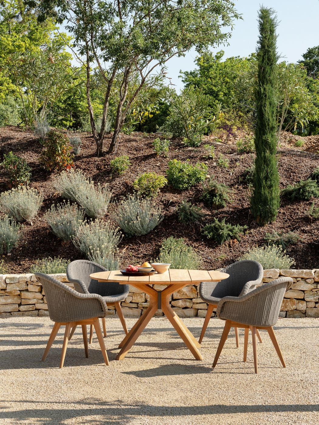 Français: Vincent Sheppard Noa Rond Table ronde de jardin Cadre en Teck non traité dessus de table Teck non traité