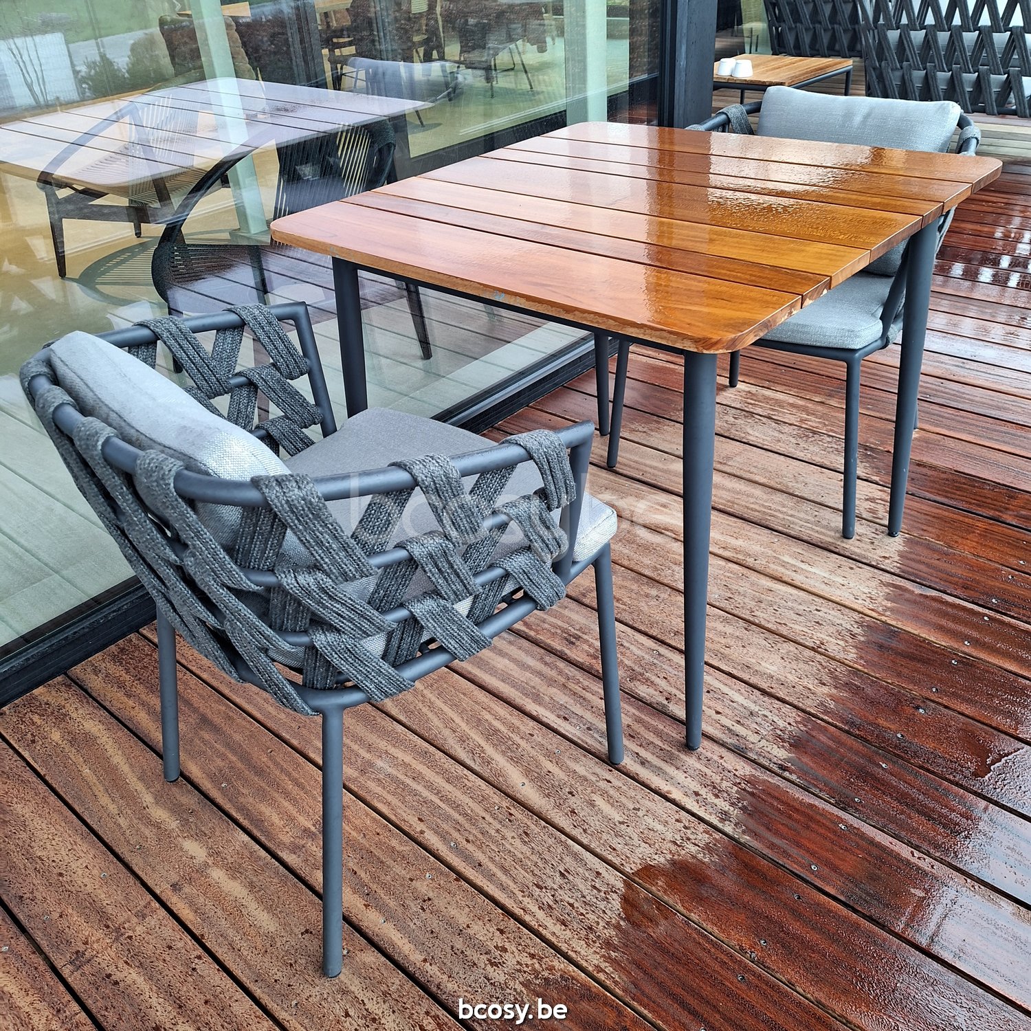 English: Vincent Sheppard Max Garden Dining Table Teak Top 90x90 Fossil Grey Aluminium frame Untreated Teak top