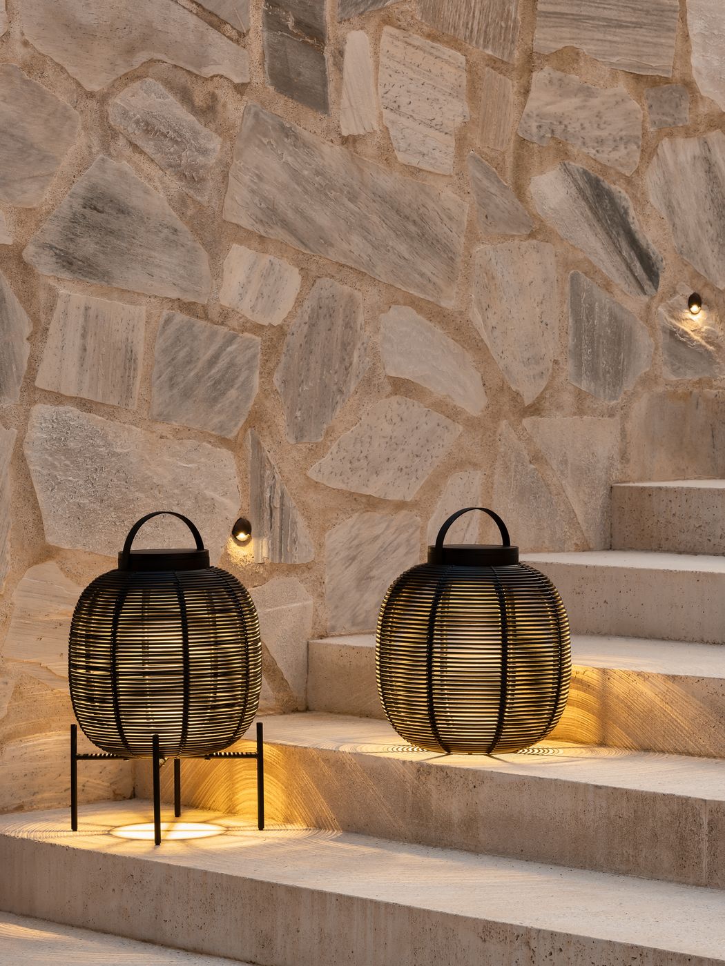 Material: Outdoor lamp in HDPE wicker on a powder coated aluminium frame. With solar led module. 3W solar LED module with light sensor included. Warm white light (2700K). EU/UK/US/AU adapter included. 6 - 8 hours light per full charge
