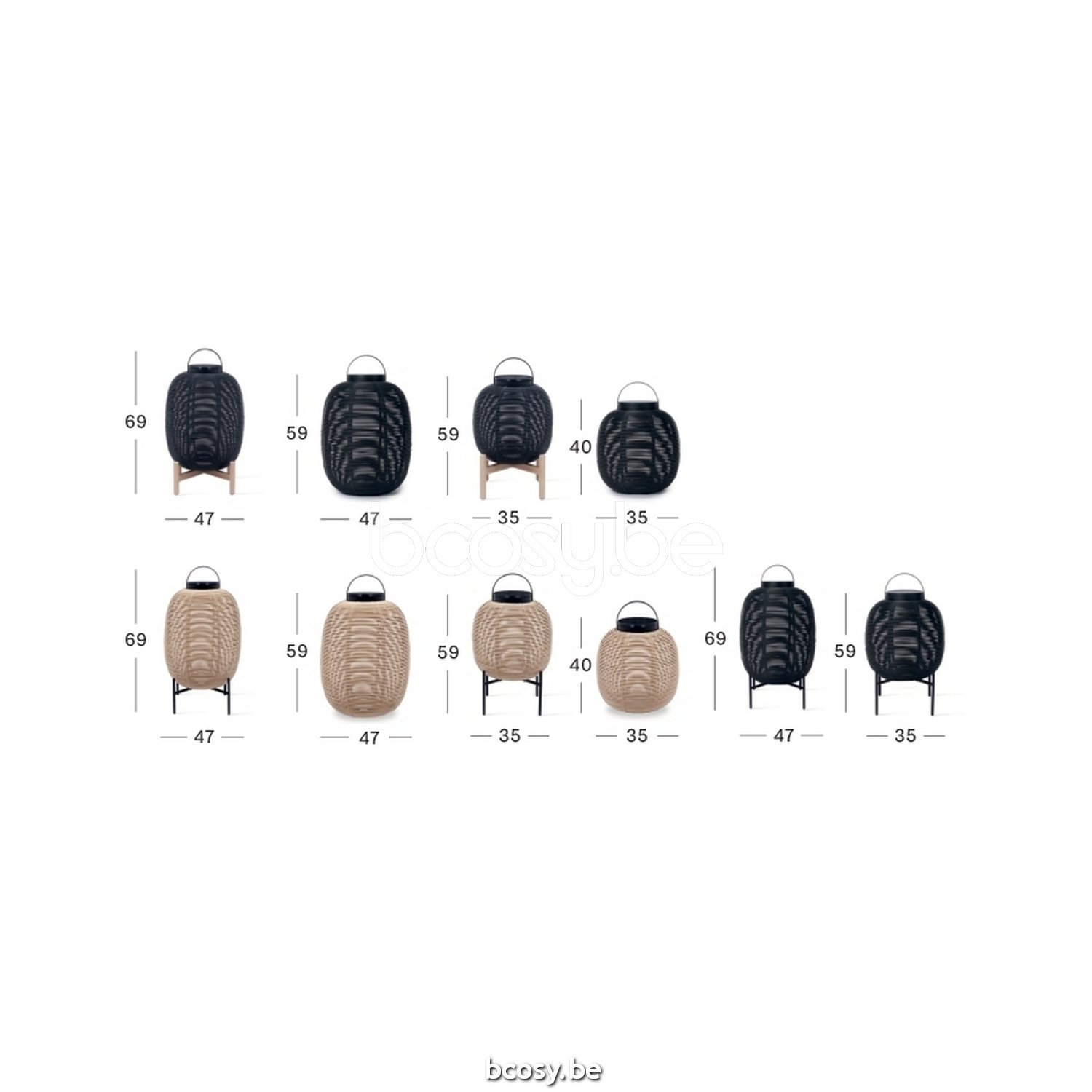 Outdoor and indoor use. Exists in Black and Camel. Small and Large and with or without base
