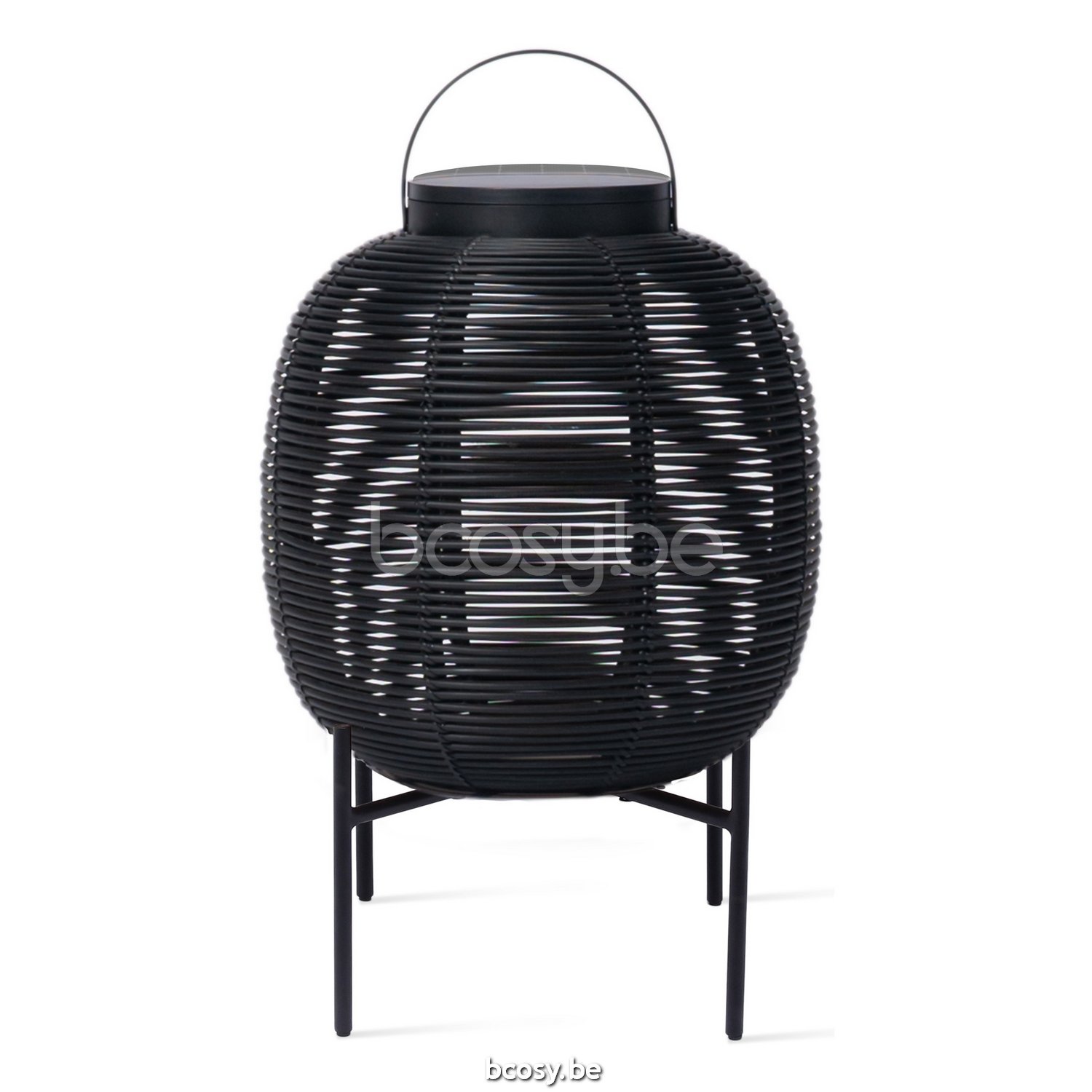 Matériel: Lampe d'extérieur en osier HDPE sur un cadre en aluminium peint par poudrage. Avec module LED solaire. Module LED solaire de 3W avec capteur de lumière inclus. Lumière blanc chaud (2700K). Adaptateur EU/UK/US/AU inclus. 6 à 8 heures d'éclairage par charge complète