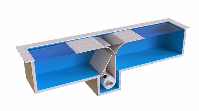 T&A Zwembad rolluik opberging met automatisch openende klep in de zwembadbodem centraal voor zwembaden me speciale vormen. Romeinse trap of ovaal.